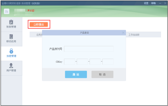 第二步:登录系统管理后点击“加密管理”,点击“立即激活”输入序列号CDkey激活如图-4所示。