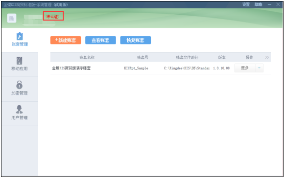 打开专业版系统管理,登录对应云账号之后,点击【未认证】按钮,系统将自动跳转到云平台,选择企业类型后,提交对应资料进行认证即可。如图-10,图-11所示。