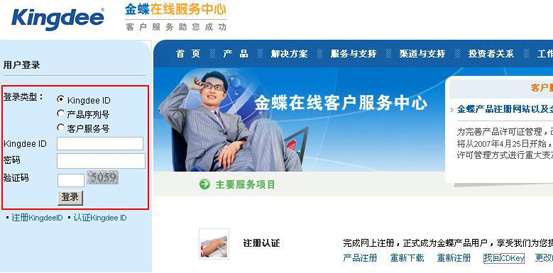 2.您请输入KingdeeID和登陆密码进入到客户服务中心。见红色标记。
