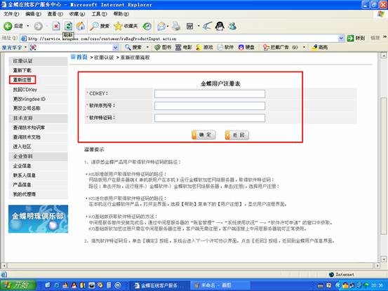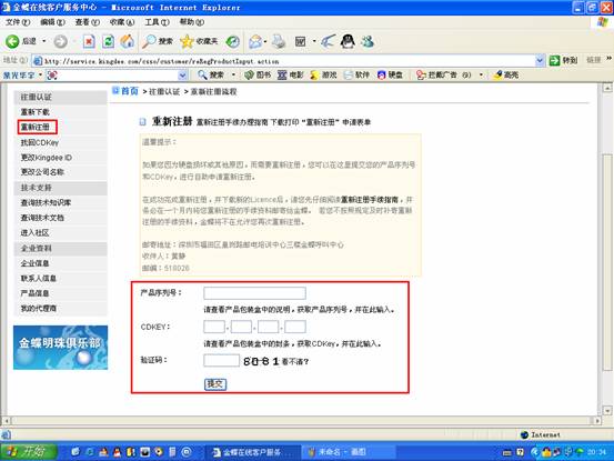 3.您进入到客户服务中心后,请点击页面左侧的“重新注册”,输入您的产品序列号、CDKEY以及验证码点击“提交”。见红色标记。