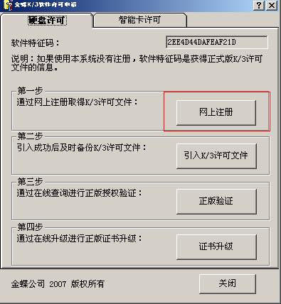 金蝶K/3 V11.0网上注册认证有两种方式:(1:硬盘许可证;2:智能卡许可证)。您可以根据您所购产品选择相对应的注册认证方式。以下是硬盘许可证的网上注册认证。