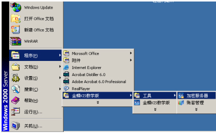 服务器端安装完成后,在服务器端点击【开始】-【程序】-【金蝶KIS教学版】-【工具】-【加密服务器】,开始运行加密服务器,如下图所示。