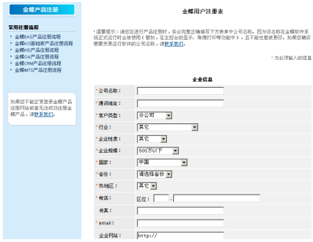 进入金蝶用户注册表页面,请输入您的资料信息:公司名称、通讯地址、客户类型、行业、企业性质、企业规模、国家、省份、市/地区、电话、传真、电子邮件、企业网址、邮政编码、联系人、手机、经销商、购买时间,如下图所示。