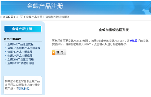 进入金蝶加密锁远程升级页面,请检查您的加密锁是否正确插入USB接口。如果正确插入,请点击页面中的【确定】,如下图所示。