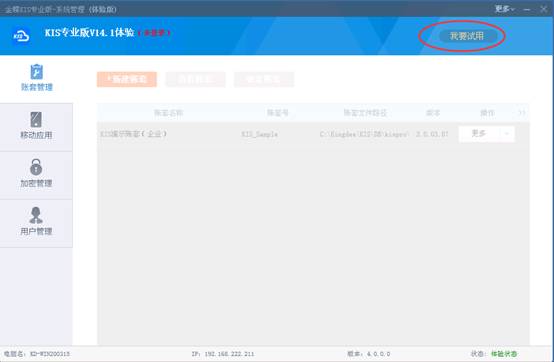 第二步:安装完成软件后,双击“系统管理”,在系统管理界面中点击“试用申请”,注册并获取金蝶云通行证账号;