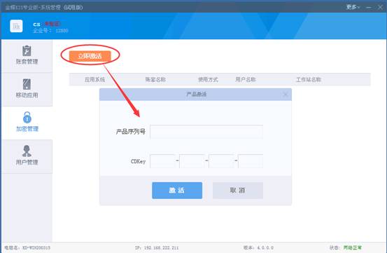 第三步:通过加密管理,录入产品序列号和CDKEY进行注册激活。