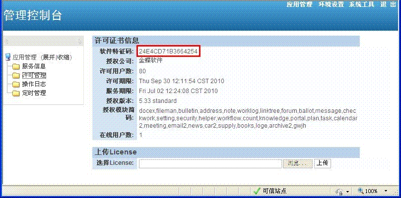 1、安装“金蝶协同办公管理软件”产品后,进入管理控制台,点击“许可管理”菜单,在许可证书信息页面中,就可以看到软件特征码信息,请拷贝软件特征码。如下图所示:
