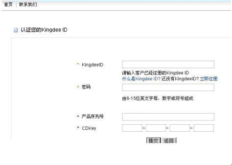 第一步:请登录金蝶产品注册网站(http://reg.kingdee.com),在“用户注册”页面输入产品序列号和CDKey,点击【我要注册】按钮,立即进入“认证您的Kingdee ID”页面。